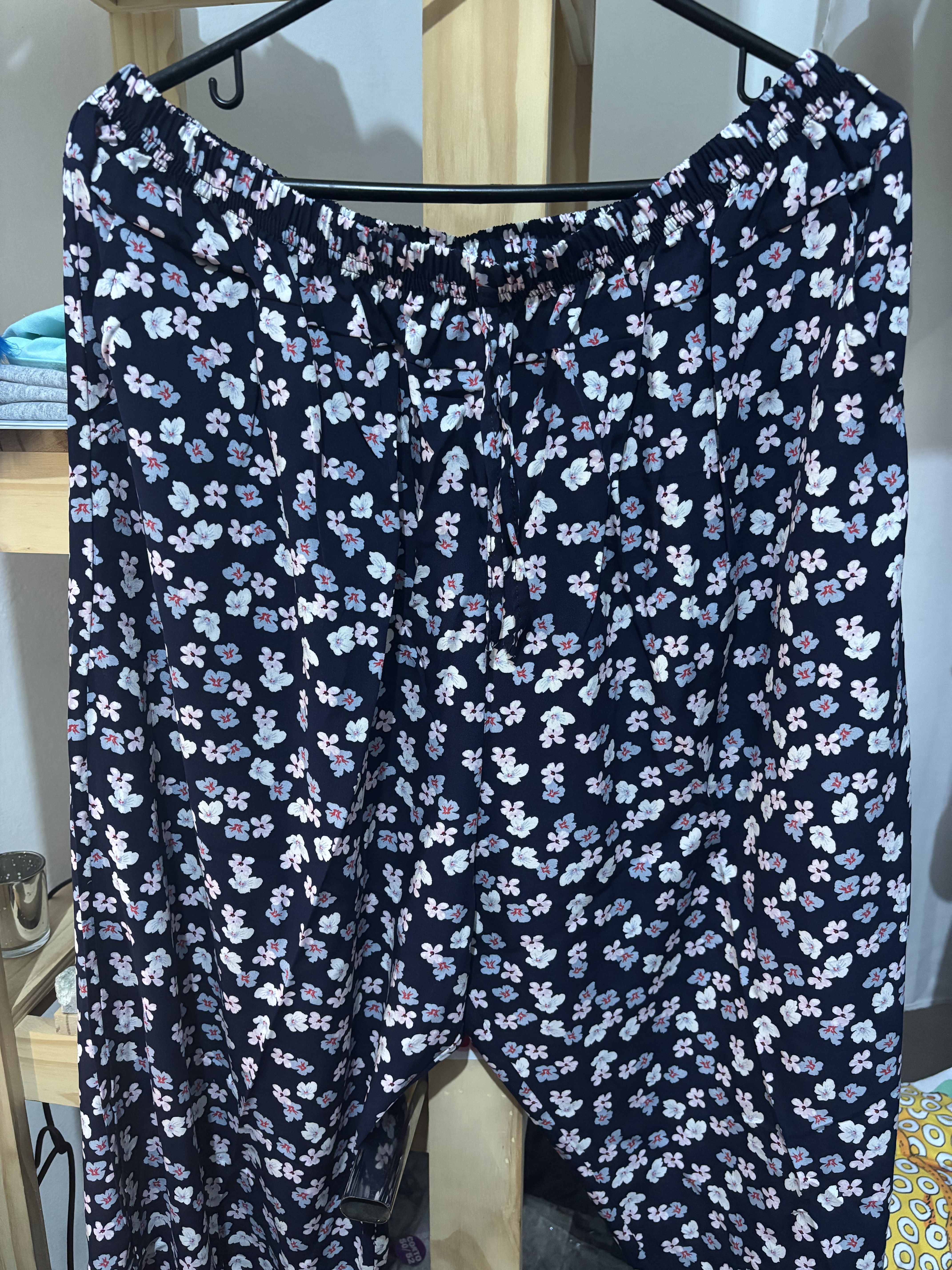 Pantalón largo negro con florcitas blancas y lila abarca hasta el talle 10
