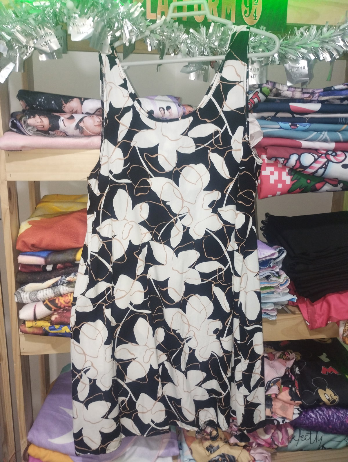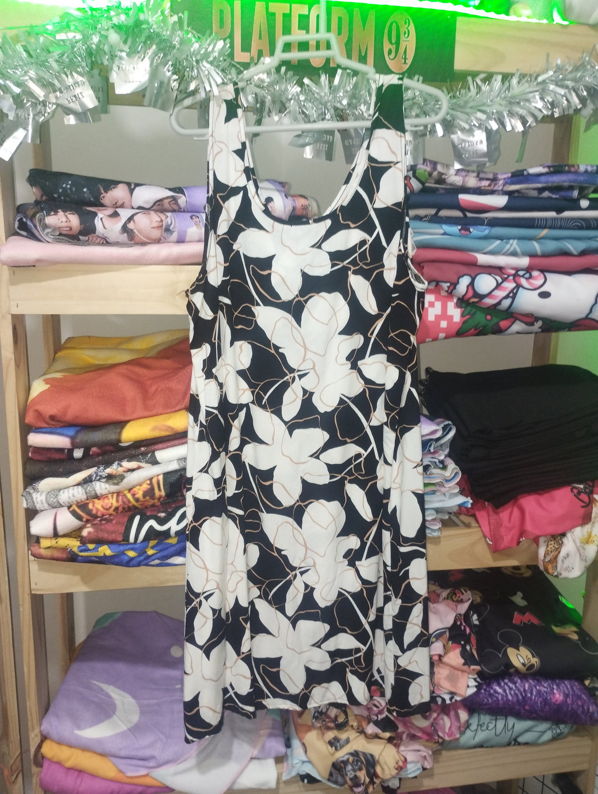 Vestido de fibrana musculosa flores blancas fondo negro talle 5
